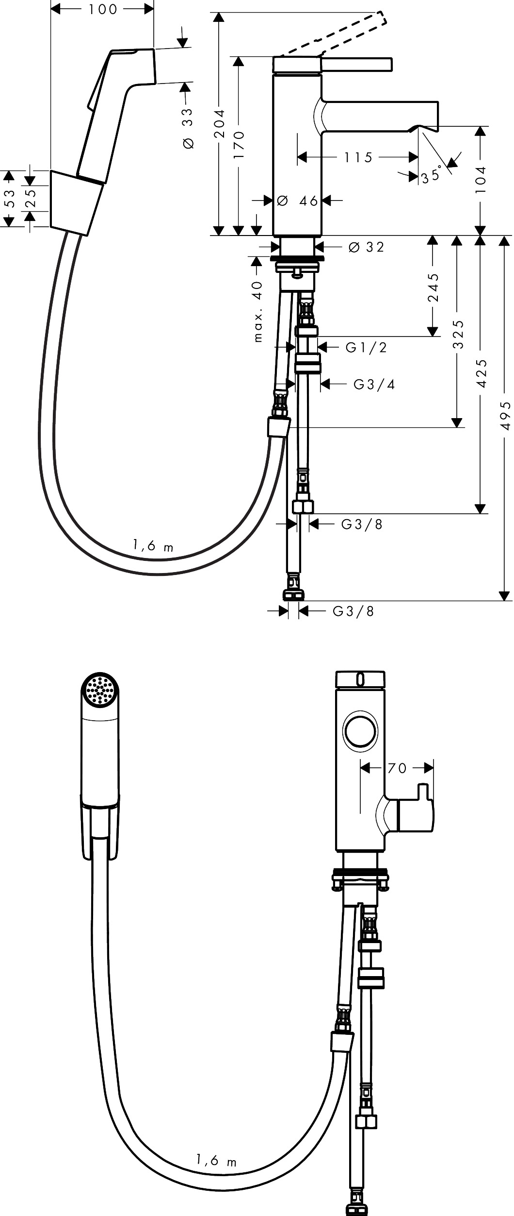 Zesis S yksiote pesuallashana Bidette pesukoneventtiilillä, ilman pohjaventtiiliä, 160 cm suihkuletkulla