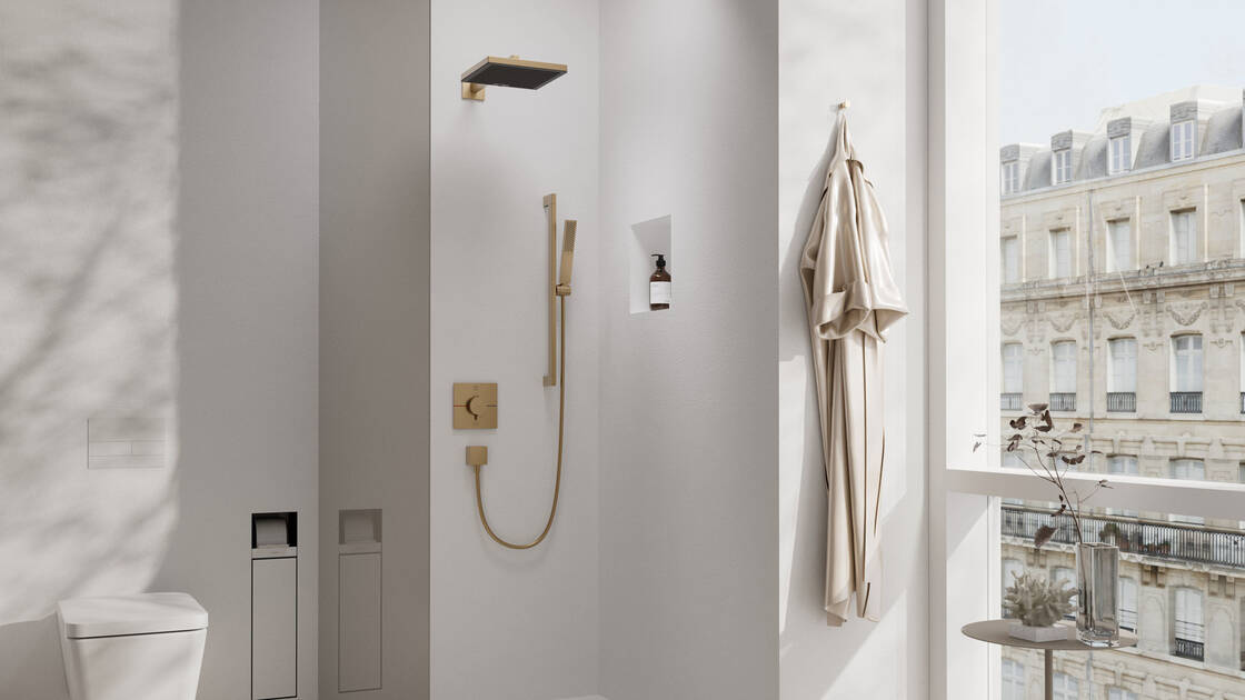 Minimalistiset piiloasennustermostaatit sopivat erilaisiin kylpyhuoneisiin. Värillisesti yhteensovitettuina ne viimeistelevät kokonaiskuvan (tässä kuvassa Brushed Bronze -pinnalla).
