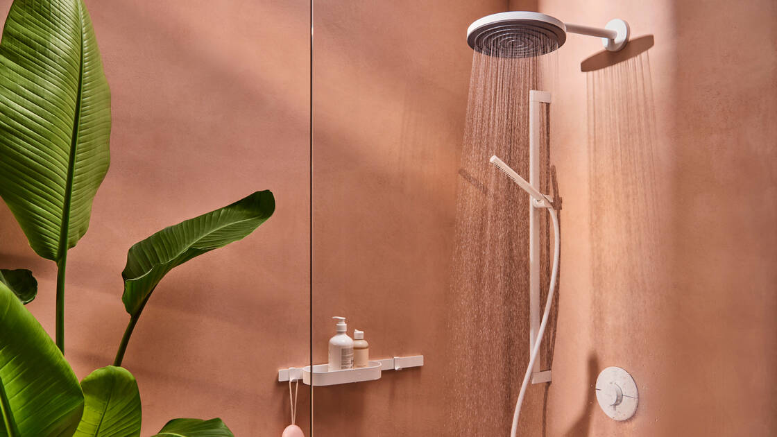 Piiloasennustermostaatin pyöreä design ja yläsuihku luovat mattavalkoisen kokonaiskuvan, joka sopii hansgrohen suihkusettiin ja WallStoris-lisävarusteisiin.